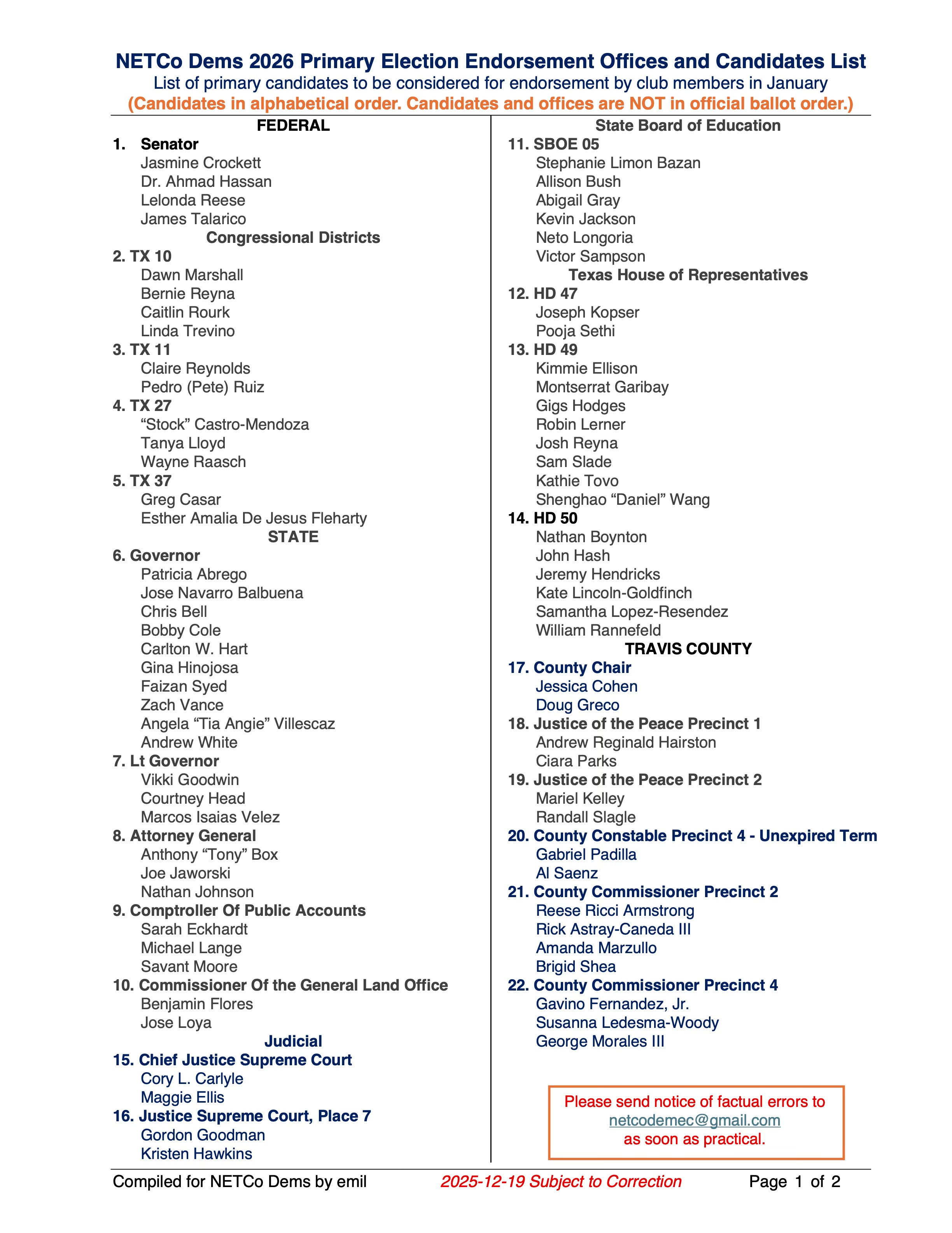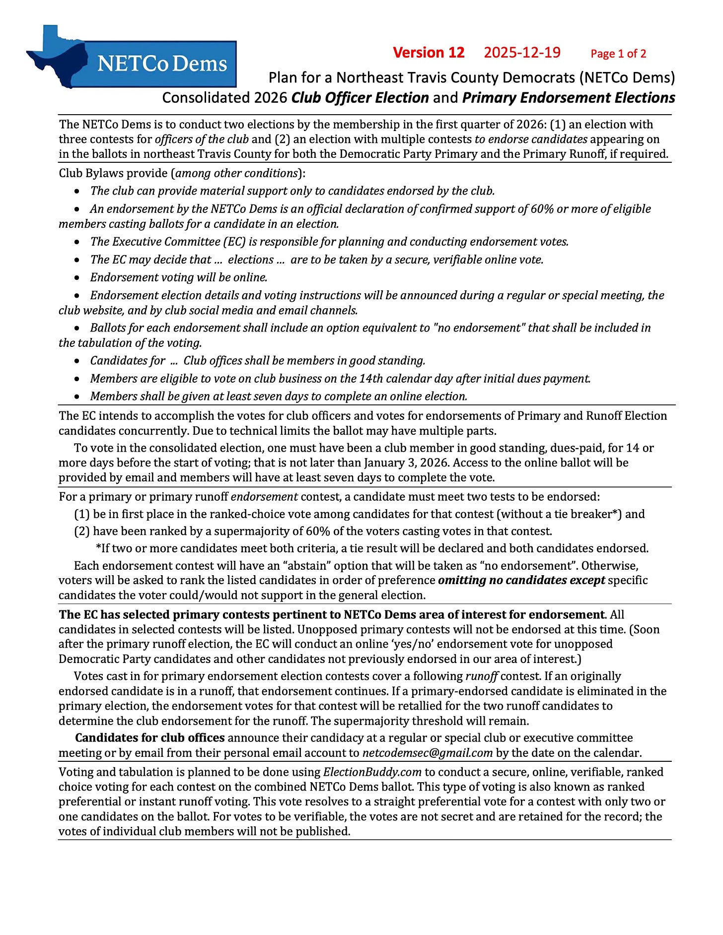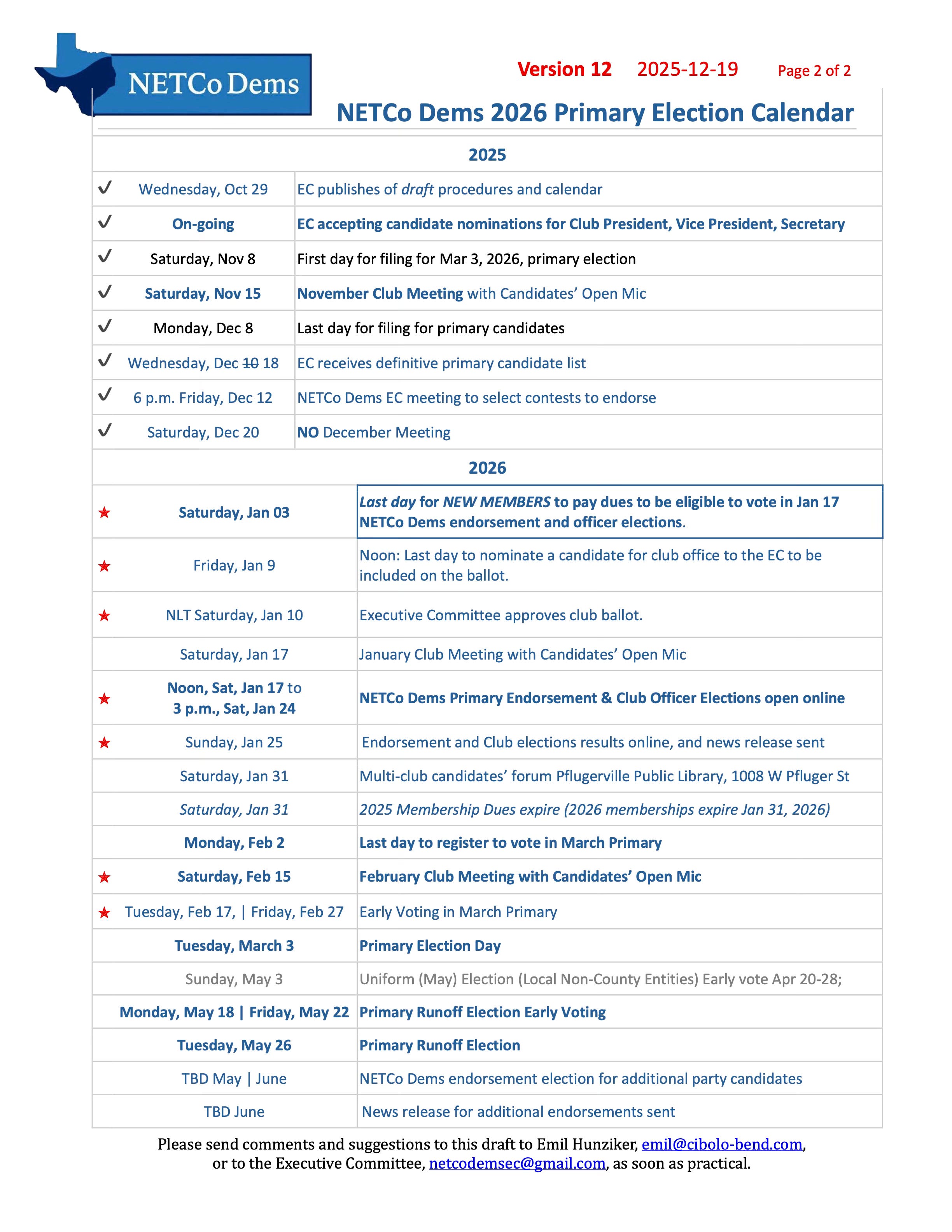 2. to determine the Club’s endorsements of up to 22 offices in the Democratic Primary Election on March 3, 2026 (Ballot by mail voting will start in early February!). The offices are those with multiple candidates and which will be on ballots in the Club’s area of interest in northeast Travis county.