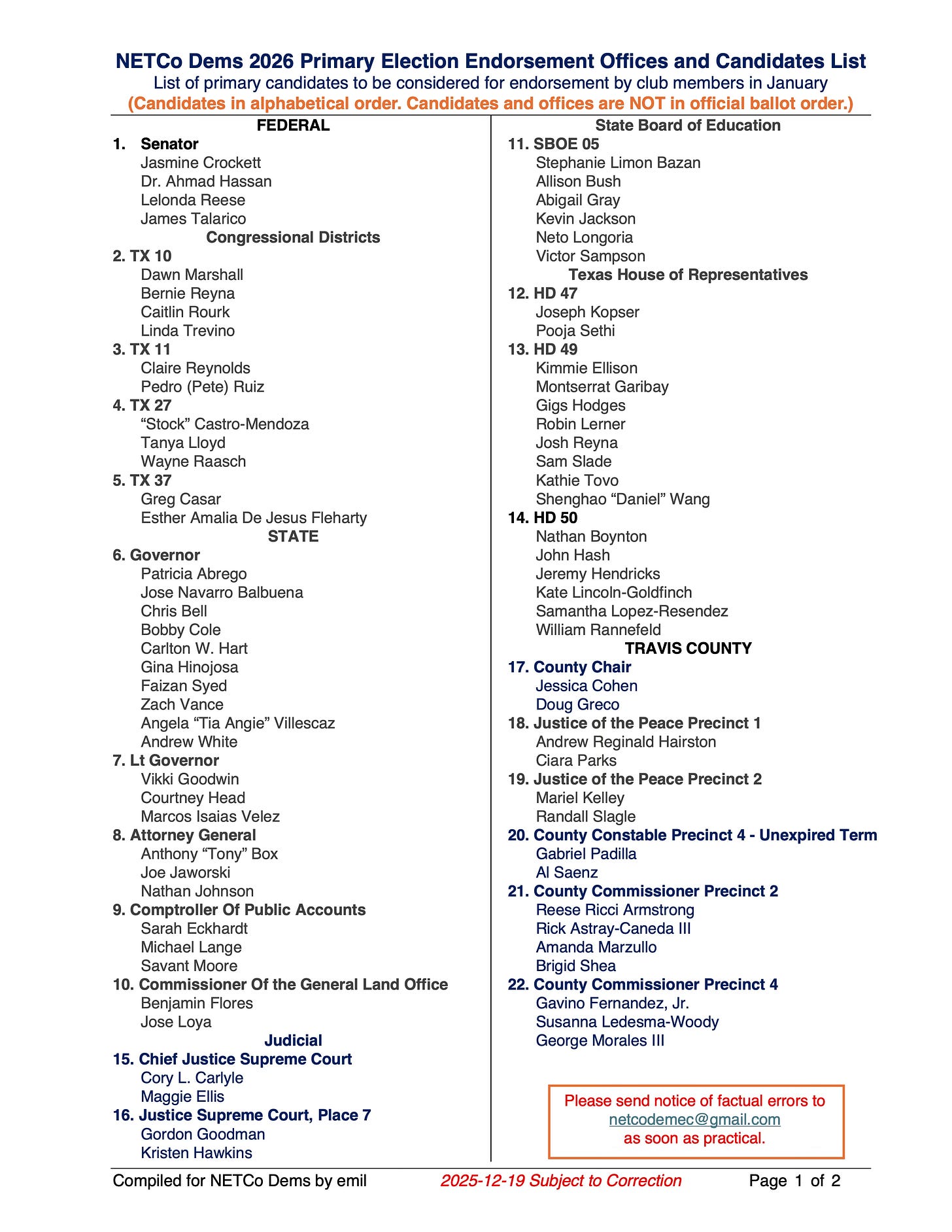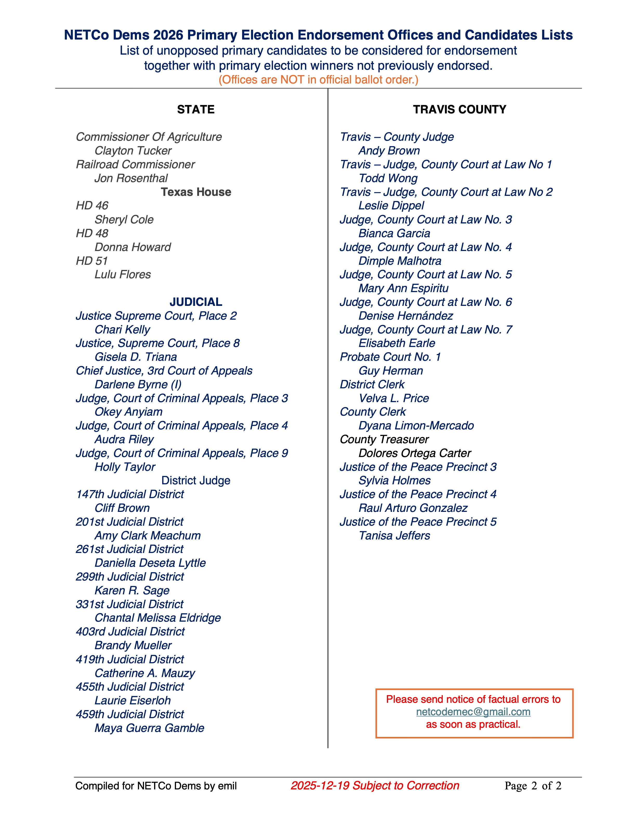 Our NETCo Dems 2026 Primary Election Endorsement Offices and Candidates List to guide our research. Page one covers candidates with opponents; page two covers unopposed candidates who will be considered for endorsement with primary winners not previously endorsed.